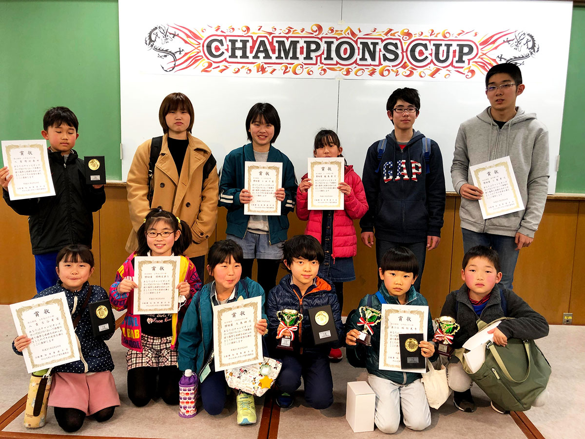 競技大会 第9回チャンピオンズカップ 平成31年2月24日(日) 第9回チャンピオンズカップに13名参加。安城市民会館で施行された大会に参加しました。 4年以下の部で木原選手が種目別見取り暗算優勝、その他の選手も個人優勝や読み上げ算競技入賞しました。