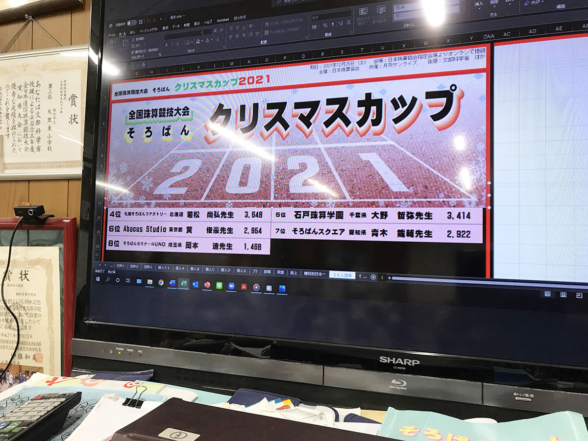 お知らせ そろばんクリスマスカップ2021 2021年12月25日(土)にそろばんクリスマスカップ2021が開催されました。 全国の1000人以上の選手がZOOMで参加し、当塾生も13人もがんばりました。
